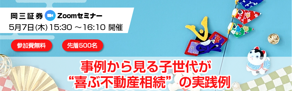本セミナーでご紹介する各金融商品等にご投資いただく際には、各金融商品等に所定の手数料や諸経費等をご負担いただく場合があります。また、各金融商品等には価格の変動等による損失が生じるおそれがあります。各ページに掲載された各金融商品等へのご投資にかかる手数料等およびリスクについては、手数料およびリスクについての重要な注意事項のページをお開きいただき、よくお読みください。